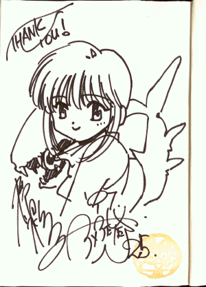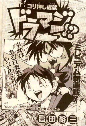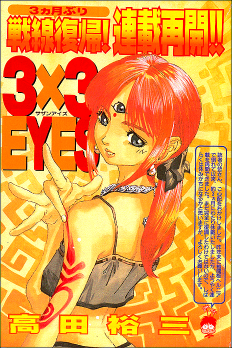 Megu-san provides the voices for Pai, Nuku Nuku, and Momiji from Blue Seed, so it's not surprising that Takada-sensei illustrated the cover of this CD. In case you couldn't guess from the tracklist above, she's also the voice of Lina Inverse from Slayers. I don't have any of Megumi's earlier CDs, but I plan to pick this one up for the Nuku Nuku songs and the bonus VHS video. Remember, this CD is limited, available only between April 26 and July 31, so order your copy soon! (For a funny look at Megumi's singing career, check out the Music section of Megumi Hayashibara: An Introduction.) More DORA MAJI!?I love titles with funny punctuation. But anyway, Yukinori Hidano sent along some more goodies for Takada-sensei's latest manga, "Gorioshi jouju - DORA MAJI!?" (The first part of the title translates to something like "Steamrolling towards fulfillment" - the word jouju has religious overtones.) Hidano-san says the manga is a little bit like Blue Seed, but for younger kids. The two main characters are Kaminari-Ryu Doramaji, a boy dragon-god with magical powers, and Akari Mizutani, a primary school student that by chance helps out Doramaji. To pay her back, Doramaji offers to grant her three wishes, and he ends up hanging around her house. Since the manga should be fairly easy to read, hopefully it will be published in tankoubon form one day. There's little chance any of us will see it otherwise, except for scans of the cover pages: The first picture is the cover of chapter 3. (More scans are below.) The second picture is a collector's item from Yukinori Hidano's collection: 3x3 Eyes manga #25 with an original signed illustration by Yuzo Takada. If you didn't know by now that Hidano-san was a hardcore fan, there's the proof. April 7, 2000SMB! on sale nowThe release date of Super Manga Blast! slipped a week, but it should now be available at your local comic shop. Check out the link above for lots of information about the monthly manga anthology, including the Pat Duke interview that seemed to vanish from the Studio Proteus page. Don't miss the long-awaited continuation of the translated 3x3 Eyes manga! New Takada mangaYuzo Takada-sensei has created a new manga called "Gori osi jyoujyu - DORA MAJI!?" The last part of the title is short for "dragon magic", but the whole thing looks more like Nuku Nuku than 3x3 Eyes to me. Two chapters were published by Shogakugan in the March and April issues of magazines targeted at young (9-11 year old) kids, and a new chapter was just published in a May magazine. More chapters are promised for the future. Thanks to Yukinori Hidano for the news, and for these scans of the manga title pages (select for larger images): The third picture above is from Young Magazine, announcing that the 3x3 Eyes manga was resuming in March. Takada-sensei is still not fully recovered, but it seems he is well enough to work. Another Story detailsThe book 3x3 Eyes: Another Story, which became available in Japan on March 23, is a collection of short stories by Katsumi Ishitsuka, Akinori Endo, and Shinichi Kusano. There are seven stories in all, and here the translated story titles.