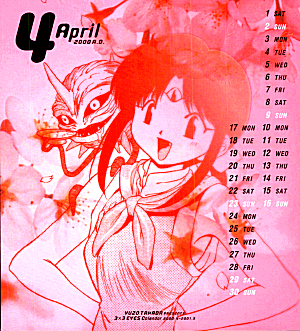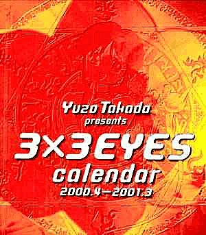 The first story title is a reference to an ancient Chinese legend about a girl that was a white snake in a previous life. The legend was the subject of a classic 1958 anime movie. The fourth story title refers to a popular Japanese TV show. The book also includes a "3-D real papercraft Fei-Oh". I have a feeling this was a preview for the 3x3 Eyes Youma Rittai Zukan (Monster 3-D Picture Book) to be published later this month. New Generation dub updatesMike Hulme attended the online chat with New Generation pictures, the company producing the new dub of the 3x3 Eyes anime. Here's what he had to say: Jonathan of New Generation Pictures said that he hopes to have 3x3 eyes screened at the next Anime Expo. It sounds like they are very enthusiastic about the project (I bet greg of Gargoyles, will fit right in with the job of Anime voice director even though it's his first). It's supposed to use stereo sound with surround effects (thanks to shabranigdo for asking about that one). They had some advice on the translations from Toren Smith and Toshi (from Viz). I asked them if one or two people were going to play Pai and Parvati and they said that their two top actresses who they had to play the part, were got by a TV series on the sci-fi channel and a movie. They want one actress to play Pai/Sanjiyan but they don't want to do it like Streamline did it, as it made him cringe ^_^. Also, Number 6 wrote in to point out a Gargoyles web page where Greg Weisman answers questions from fans. In a message posted there, he reveals the some of the cast for the new dub, including the voice actors for Pai/Sanjiyan and Yakumo. The most exciting news to me was that he says it will be a two volume release, which means that the entire second OAV series will be released on one tape or DVD, similar to the Perfect Collection for the first series. Hopefully each 2-hour volume will have a nice low price. Manga Max, Animerica featuresMike Hulme also pointed out that issue 16 of Manga Max magazine contains a 3-page article on 3x3 Eyes. This is a UK magazine, but according to an advert in Super Manga Blast! #1, it is available worldwide. Ask for it at your local comic shop. Also, the latest issue of Animerica focuses the Animerica Spotlight on 3x3 Eyes. The 4-page article contains an introduction to the series, information about Yuzo Takada, and 9 character profiles. Thanks to Zach Rasmussen for this news. 2000 calendar imagesYukinori Hidano, in addition to finding the Dora Maji manga above, was lucky enough to receive one of the very limited copies of the 3x3 Eyes 2000 calendar. He sent along some images of the first two pages so that the rest of us poor souls could at least see what it looks like. Enjoy. (Select the images below to see larger versions.) I like the cherry blossoms in the second image. |