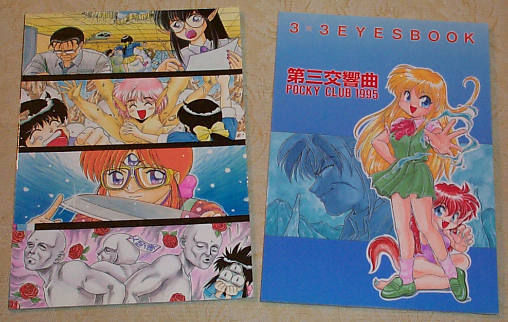 September 17, 2000Super Manga Blast! #5 delayedAlthough issue 5 of SMB! was scheduled for August 9, it was delayed until September 13. According to this month's Fan Feedback on the Studio Proteus web site, the delay was caused by Radio Comix leaving the project. This latest issue is now available in comic shops, though, and future issues should be returning to a regular monthly schedule. Thanks to Chris Hughes-san on the 3x3 ML for spotting this news. By the way, if you go back to the August Fan Feedback on the SP site, you'll see a question from me about future 3x3 Eyes trade paperbacks. According to Toren, TPBs will depend on "sales factors, fan and retailer feedback, and a variety of other factors." For now, you can buy back issues of SMB!, but it probably wouldn't hurt to send a message to Studio Proteus or Dark Horse and let them know you want to see more TPBs for 3x3 Eyes. Transcript of second New Generation chat postedAnime.About.com has posted a transcript of the second chat with New Generation Pictures back on July 27. They mainly discuss Nanako, but there are some comments about 3x3 Eyes as well. Jonathan Klein and Taliesin Jaffe were entertaining as always, so it's a good read. Manga #35 in December, but no calendarAccording to the Young Magazine web site, 3x3 Eyes #35 will be published on December 6. That was the good news. The bad news is that there will be no 3x3 Eyes calendar next year, or any other calendar by Yuzo Takada. If you want to put a little positive spin on this news, it means we foreign fans will be spared the disappointment of not being able to obtain the calendar. (I'm still upset I couldn't find the Genzo calendar last year.) Anyway, if you want a Kodansha calendar featuring some manga monsters, check out Amon Devilman: Apocalypse (3rd down on right). Doujinshi discoveredI almost forgot! I recently got two 3x3 Eyes doujinshi (fan-produced comics): Kuru Kuru Pai and Dai-San Koukyoukyoku (Third Symphony). Here are pictures of the fronts and backs of the books. Kuru Kuru Pai is hilarious. I acquired the manga from Doki Doki Station for a rather high price, but this stuff is next to impossible to find even in Japan, so I thought it was justified. |